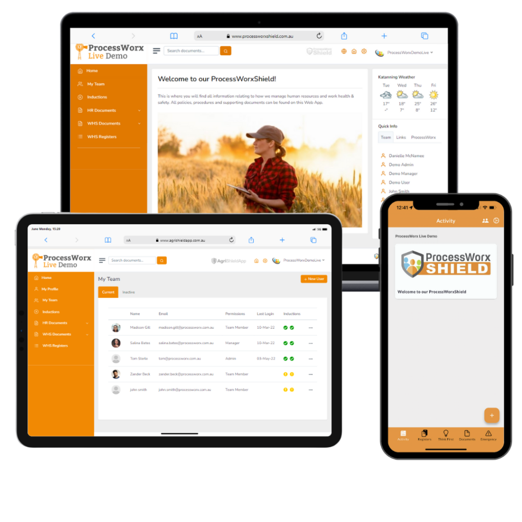ProcessWorxShield, the Shield is our proprietary cloud platform and mobile app. It takes care of your HR and WHS document management, and features e-learning modules, registers, inductions and our dedicated Employee ‘Kiosk’.